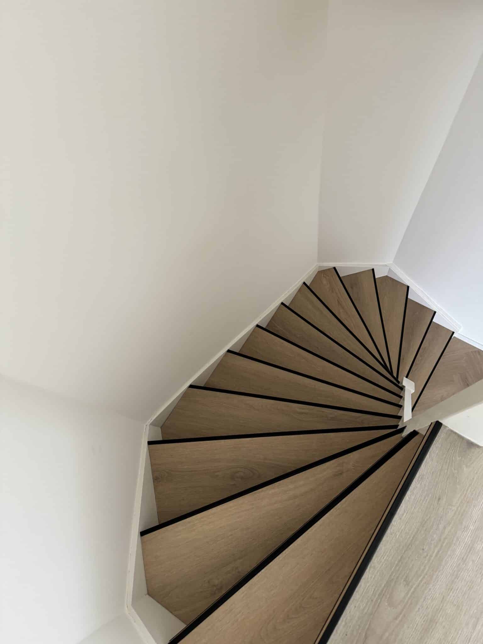 Na het advies viel de keuze van Esther op de Vivian beige eiken XL visgraat vloer, een prachtige, warme basis die meteen sfeer brengt in de woning. Ook de trap werd meegenomen in de metamorfose: met een bijpassende PVC traprenovatie vormt alles nu één stijlvol geheel.