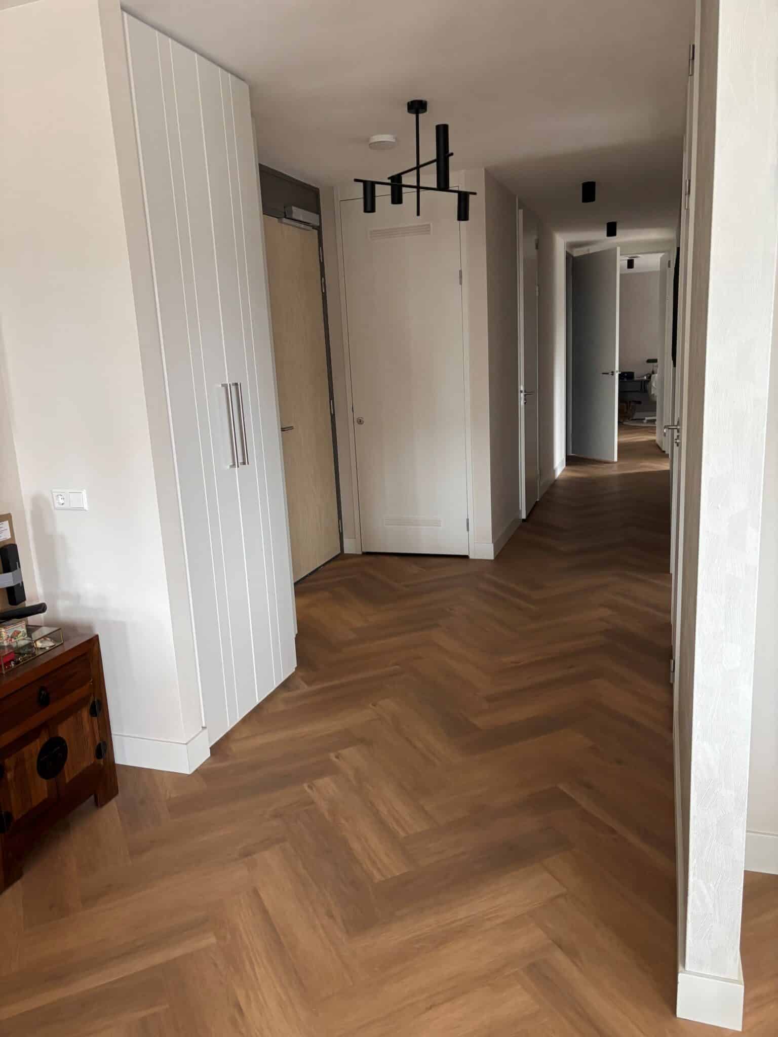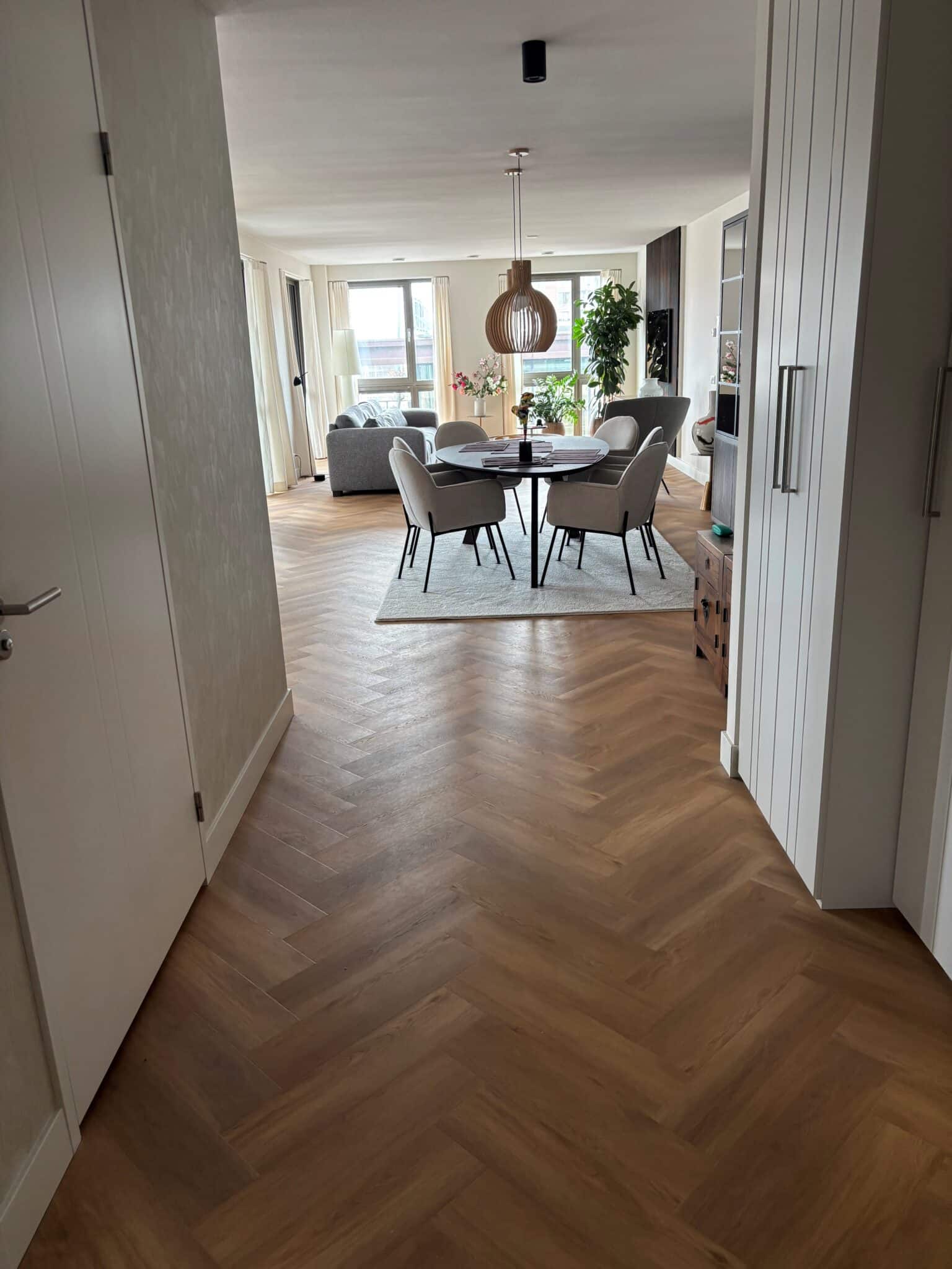 De keuze viel op de Core naturel eiken visgraat PVC vloer – een warme en rustige vloer met een natuurlijke uitstraling. De visgraat legt een subtiel accent in het interieur zonder te overheersen. Het past perfect bij de sfeer van zijn appartement, modern en toch warm.