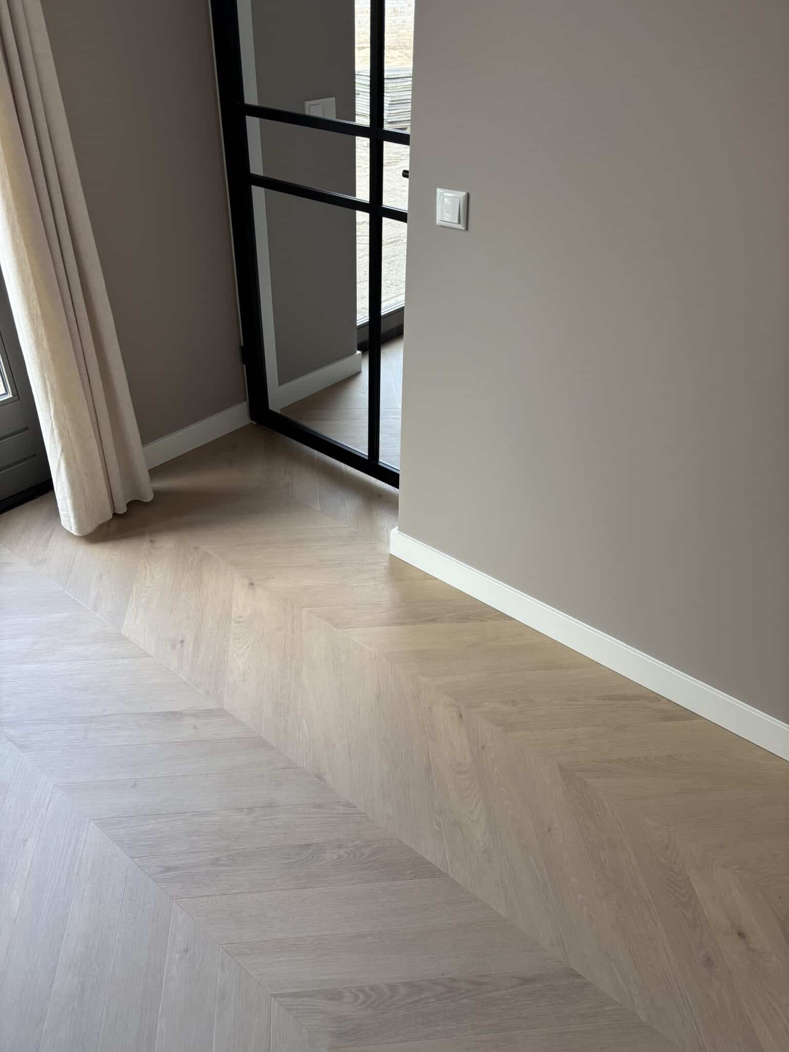 De Julia greige eiken PVC vloer in Hongaarse punt combineert een zachte kleur met een stijlvol patroon. De greige tint — een mix van grijs en beige — voelt warm én neutraal tegelijk. Ideaal als je een rustige basis zoekt zonder dat het saai wordt. Kies je voor onze all-in legservice? Dan regelen wij het hele traject: van egaliseren tot strak afwerken. Geen losse aannemers, geen gereedschap, geen stress.