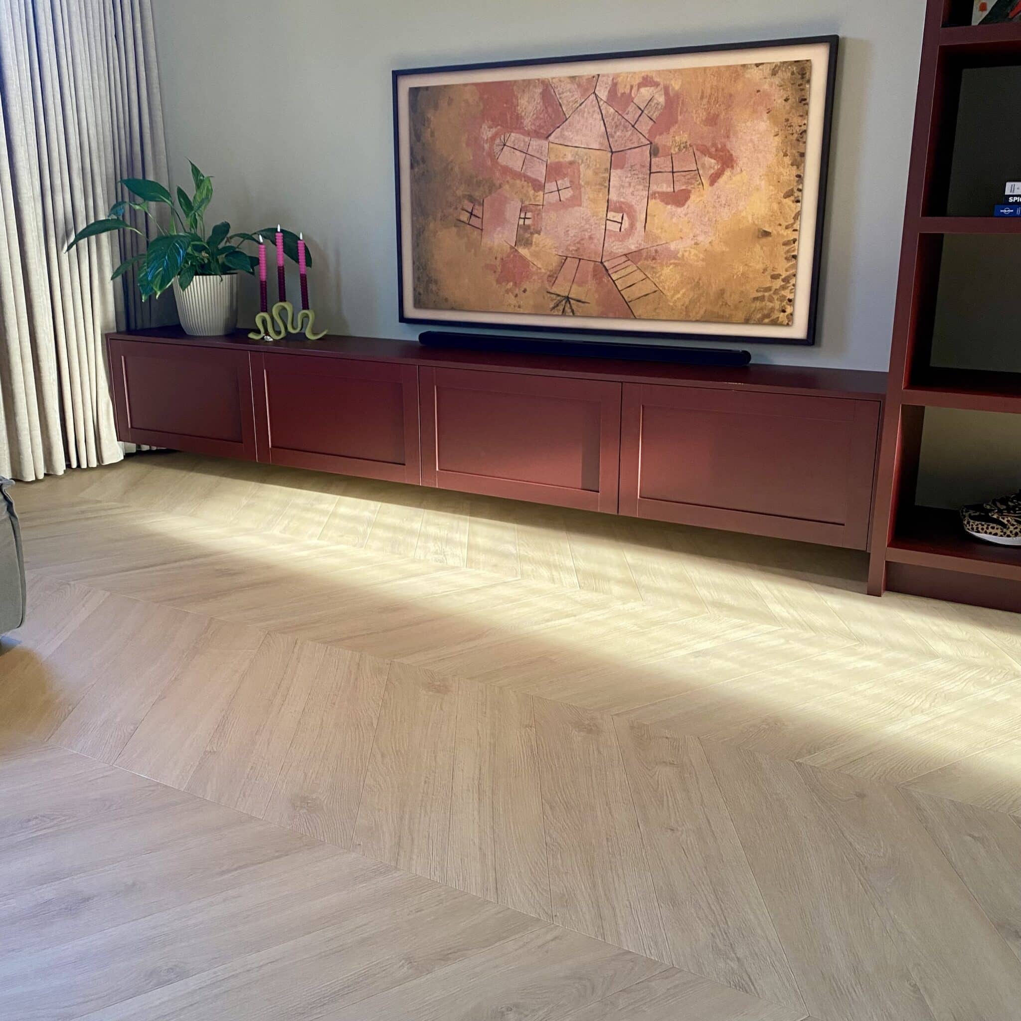 De Sophia natuurlijk eiken PVC vloer heeft een rustige, vriendelijke kleur die warmte brengt in elke ruimte. Het patroon in Hongaarse punt zorgt voor net wat extra karakter, zonder druk te worden. Dankzij onze all-in legservice hoef je niets zelf te doen. Wij verzorgen alles: van ondergrond egaliseren tot verlijmen en afwerken.