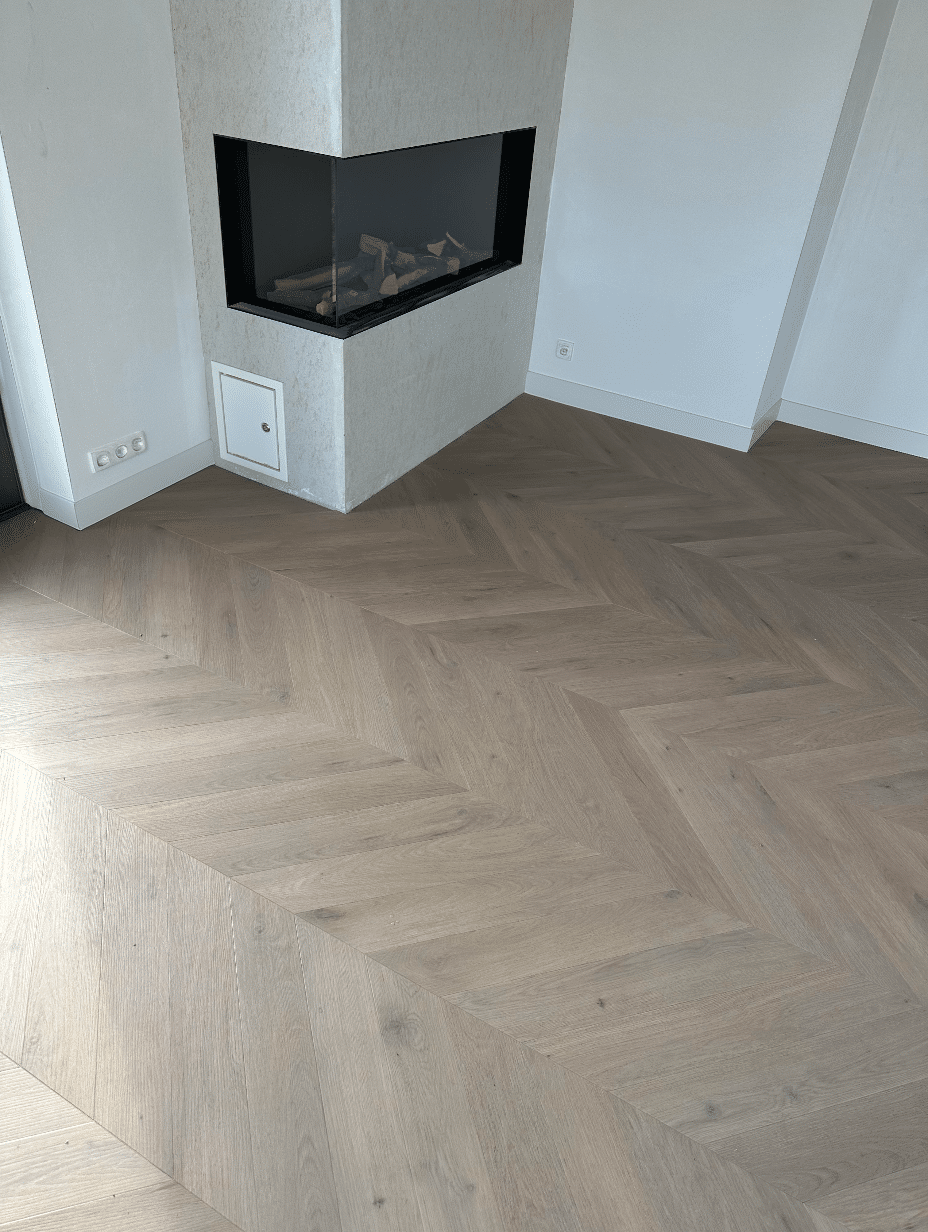 Dankzij het Hongaarse punt patroon ontstaat een strak lijnenspel dat direct een gevoel van luxe en diepte toevoegt aan de ruimte. Dit klassieke patroon is geliefd vanwege zijn symmetrische, schuine plaatsing van de planken en zorgt voor een chique en speelse uitstraling.